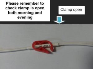 It is important to check the small clamp on your central venous device, to make sure that it is in the ‘open’ position when your pump is attached (please see figure 1).