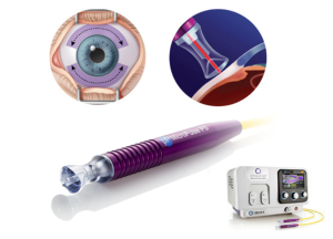 The 1a image shows a G cyclodiode probe being used to deliver a laser to the ciliary body (fluid-producing tissue inside the eye).